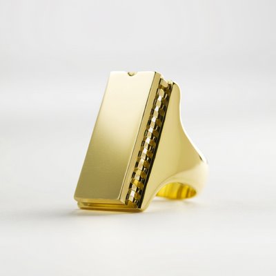 This hand-fabricated, 18 karat gold man’s ring features a precise cast of the original Ataricomputer chip.